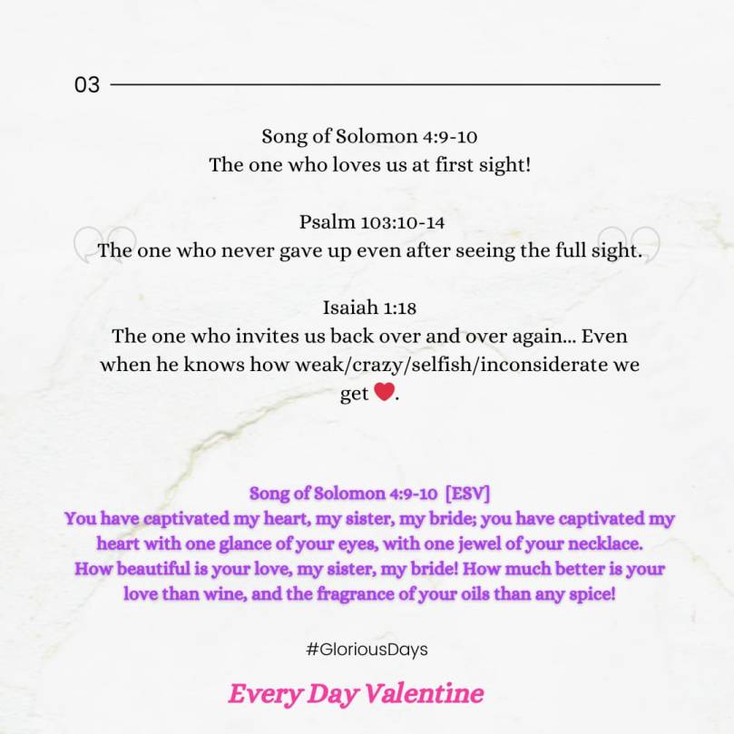 This Easter season is a perfect time for us to be reminded of God’s love for us. We looked at the God who loves us inspite of who we are in the first part of the Every Day Valentines series. We then looked at the God who is Faithful through and through in the second part of the series. We will wrap up this series by looking at how the perfect love of God enables us to love each other.